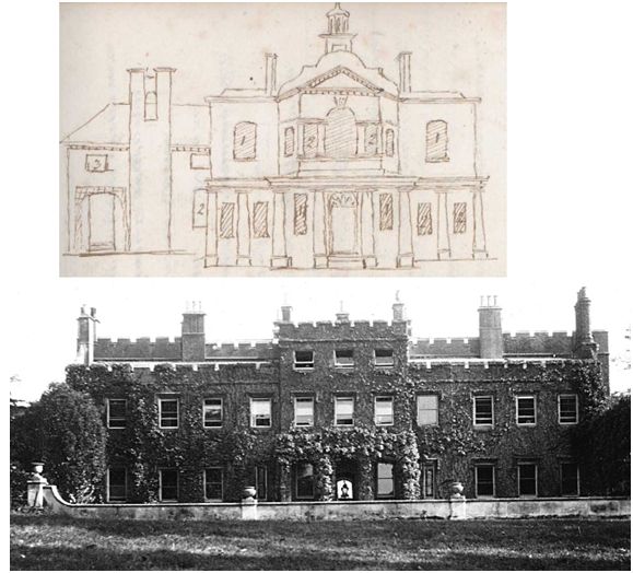 Figure 1 – ‘Elizabethan’ Hall 1751 (upper) and the Georgian Hall early 20c (lower) – western aspect